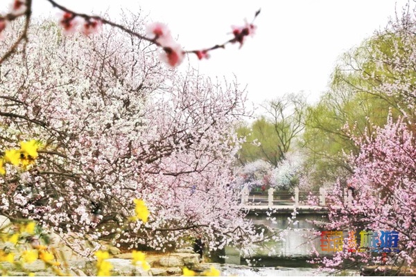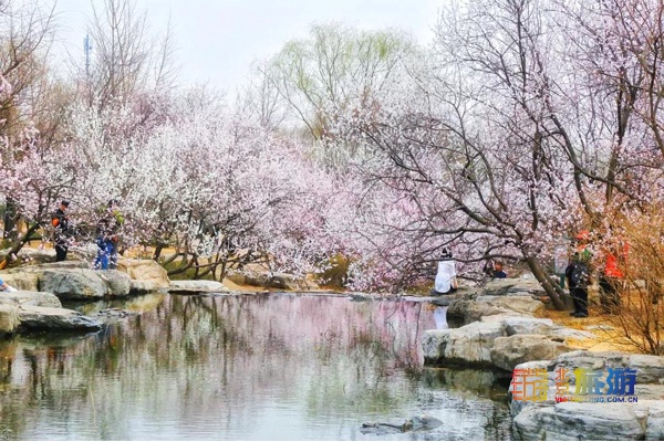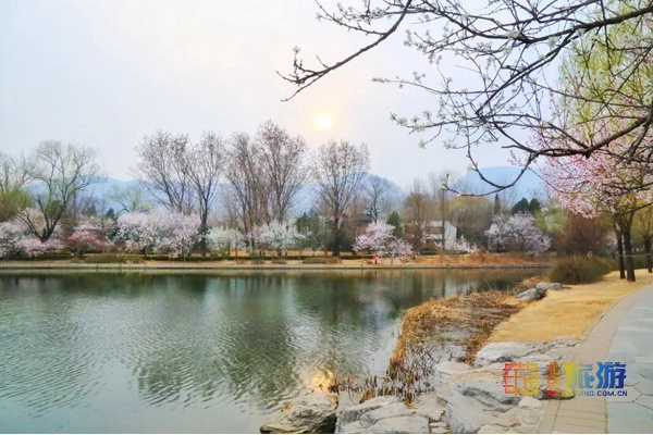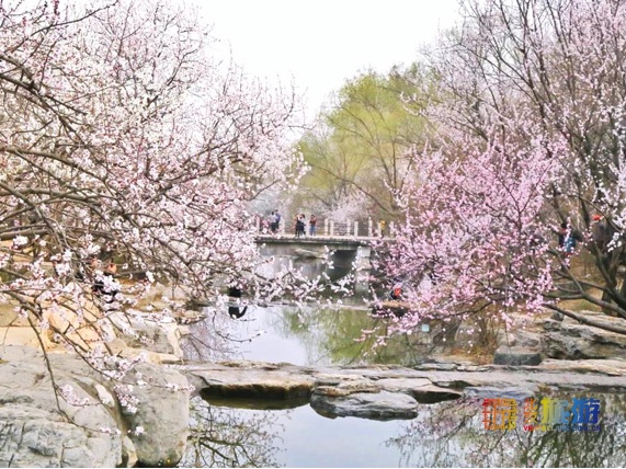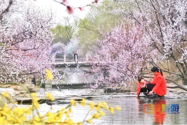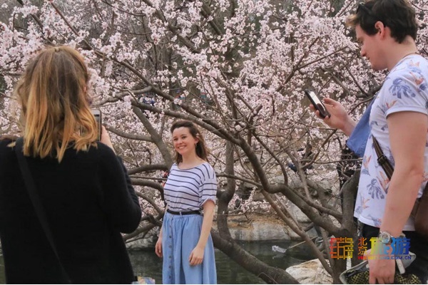 山桃花畔,一泓春水沿叠石奔流而下,展现春日的暖煦与柔情,桃花胜景引来了不少游人,不仅咱们国人称美,就连外国友人也连连称赞。