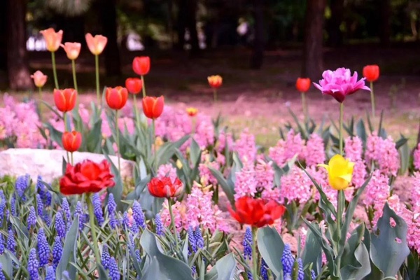 “国泰民安”展区:以郁金香为主,采用色带形式种植,混合风信子等球根花卉。