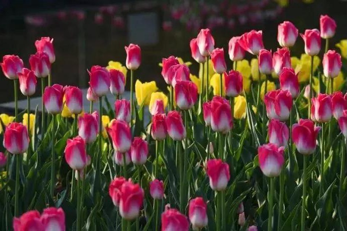 “和谐稳定”展区:选择早、中、晚期郁金香6至9个品种混合搭配,早期呈现粉色系,中期呈现黄色系,晚期呈现红色系。