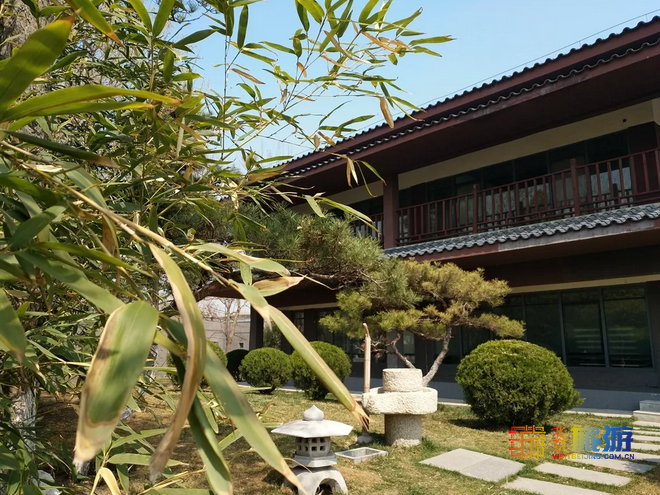 几丛修竹构成了梦唐园的围墙,里面是一个小巧的池塘,有几座小木桥横跨在池塘上面。庭院内的亭子旁边,樱花与桃花都开得灿烂无比。
