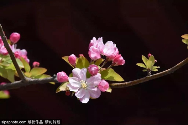 海棠花未开时,花蕾红艳,似胭脂点点~开后则渐变粉红,于淡雅中显艳丽,似亭亭玉立的少女。虽未施脂粉,却娇艳欲滴到引人侧目~