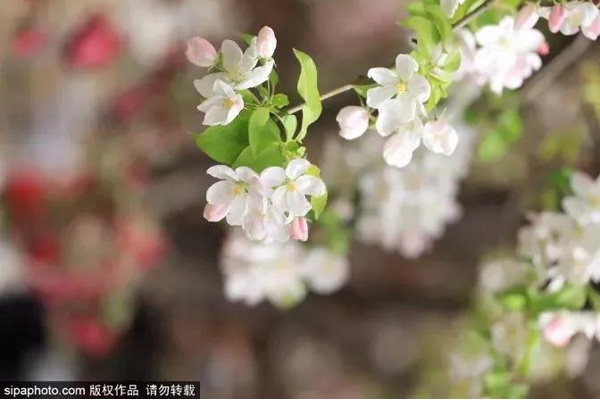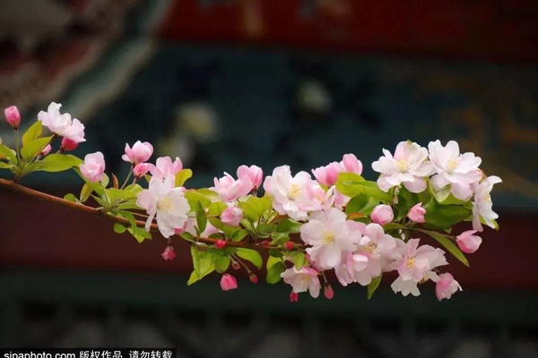 元大都遗址公园复建了古代的建筑,在红墙灰瓦、红色的木格窗前,几枝海棠曼妙伸展古意浓浓。海棠花形较大,新长嫩叶簇拥着四至七朵花缀满枝条~