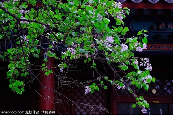 早春四月,丁香花开,掩映着古寺的红墙碧瓦,颇有古韵。