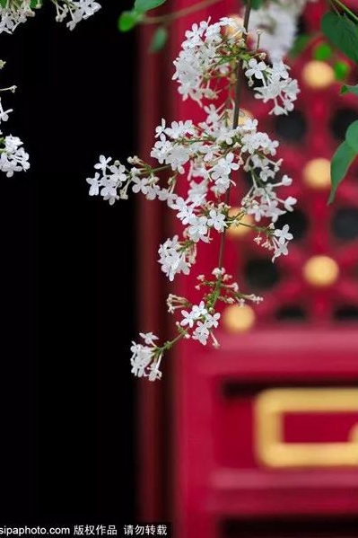 寺庙不大,遍植丁香。除了紫丁香和白丁香,还有南洋马鲁古所生的丁香。每年四月,花儿都会如期绽放,如同一朵朵祥云,掩映着红墙青瓦、雕梁画栋,简直就是一幅“胜地花开香雪海”的美景。