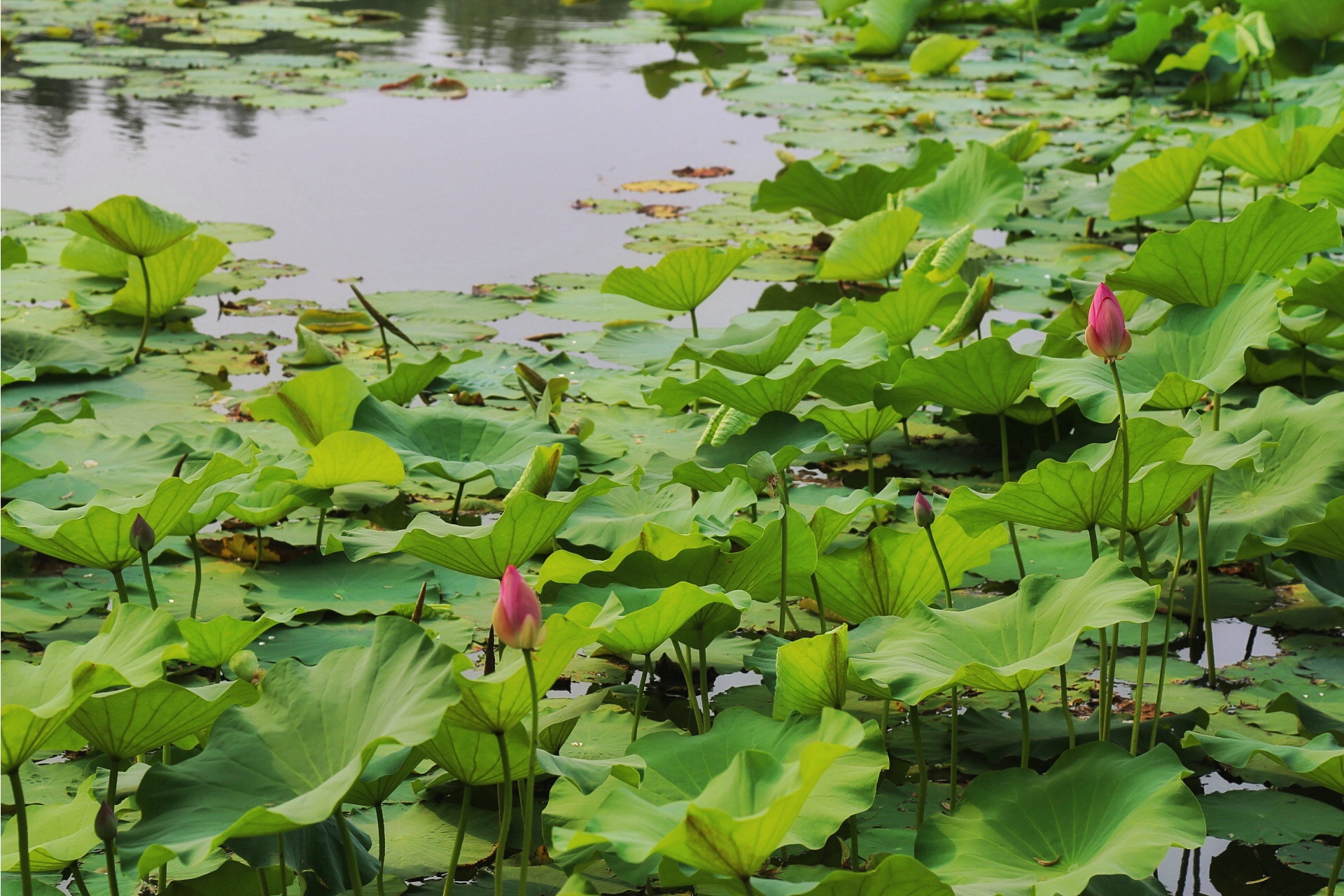 一片绿波随风翻滚,万柄红荷散点摇曳,放眼望去,俨然是荷的天下,池中荷花与红鱼悠游相映成趣,如此美丽的景致,你怎可错过。