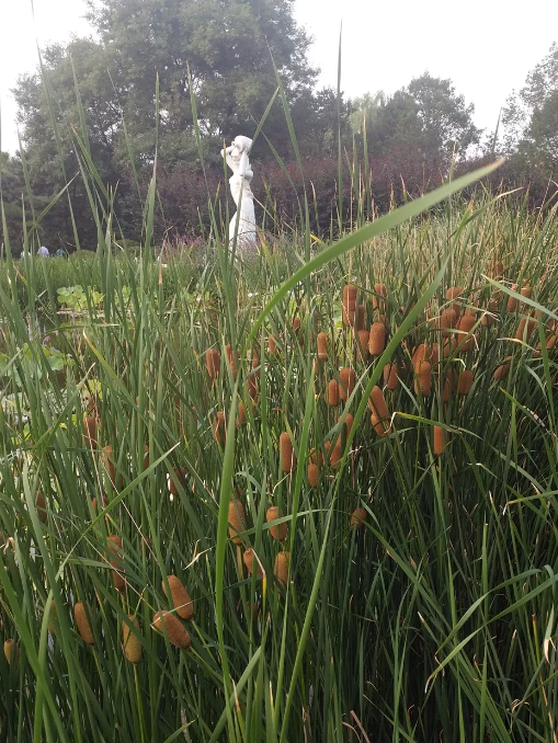 在前面的荷叶荷花当中是一座小小的雕塑,胖娃娃骑在大鲤鱼的背上。不过,不知道是谁将柳枝放在了娃娃的脑袋上,让胖娃娃变成了“胡吧”。