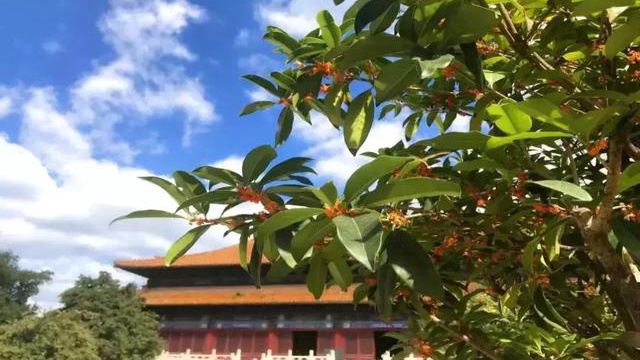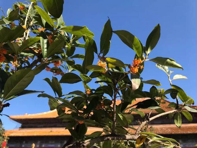 桂花枝叶婆娑,花香袭人,置身于这气势磅礴的古老建筑景观下,迎着微风吹来的阵阵桂花香,仿佛置身于仙境一般。