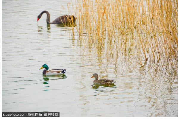 秋日天高云淡,让这里的秋水也更加澄澈,偶尔,这里的精灵黑天鹅优雅地游过,滑破了平静的湖面。