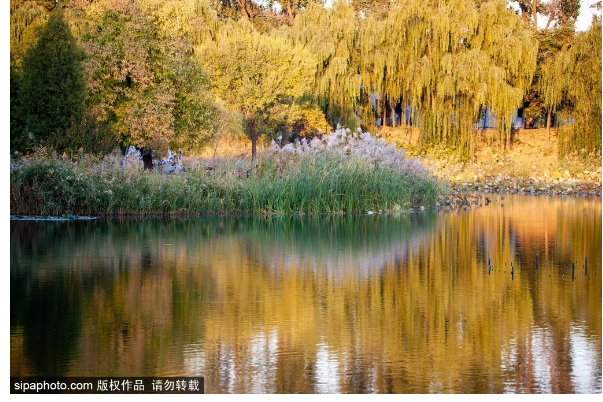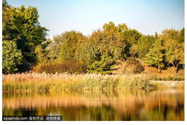 园内的枫树,在秋风的吹拂下也逐渐要换上秋日的色彩,带来一片火红还有金色,圆明园的银杏大道待到11月份,将成为一片梦幻般的金色大道。而河边湖畔的芦苇与荷叶,现在已经变黄了,像是给碧蓝的湖水,镶上一道金边。