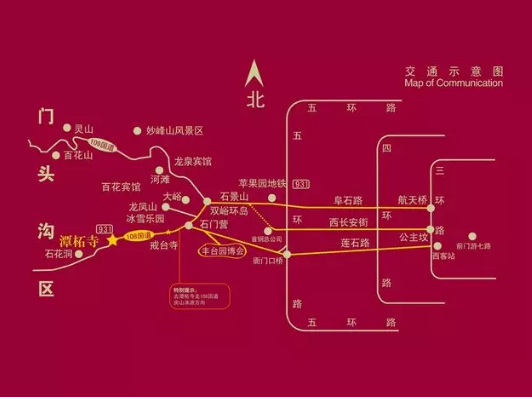 自驾路线:西五环衙门口桥上京原路(莲石西路)向西,大约十公里到达潭柘寺。(沿途有路标)