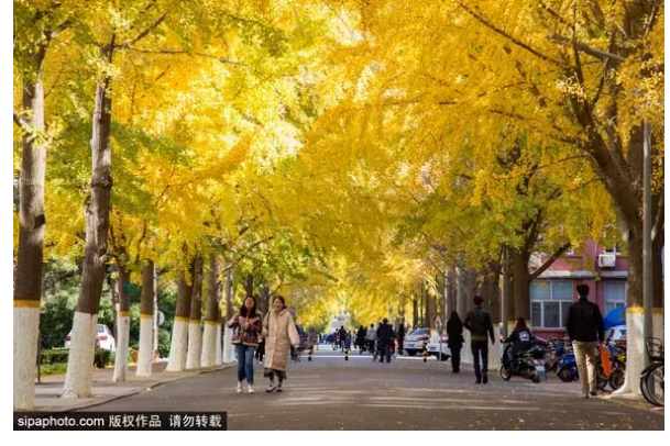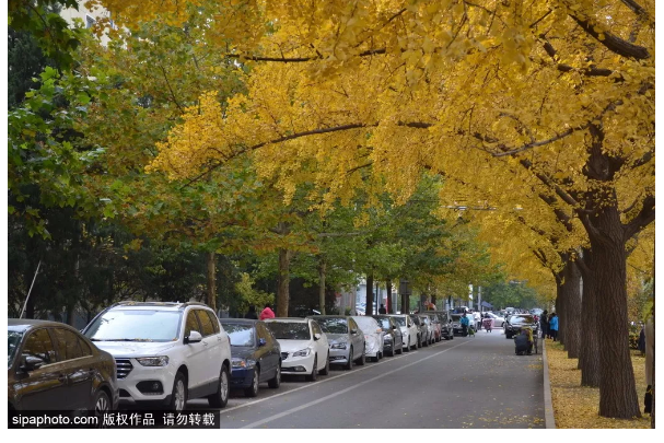 每至深秋,街道两侧的银杏成了北京人青睐的对象,满树的金黄给这条街增添了不少文艺气息。秋风起,片片银杏随风飘落,美得不成样子。