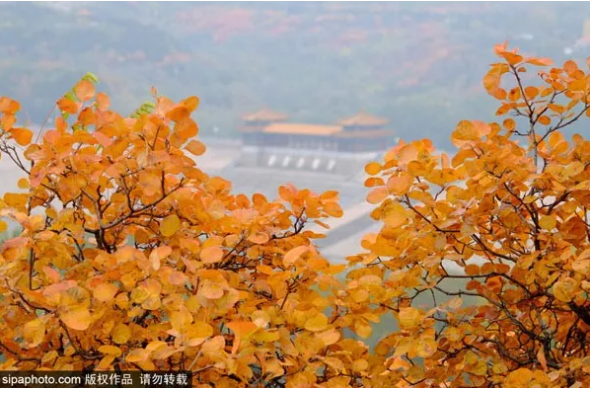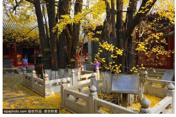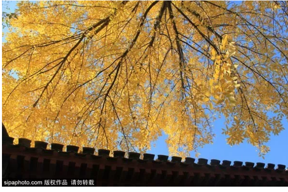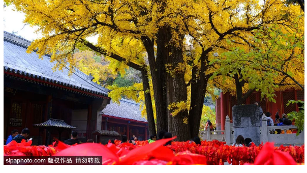 怀柔区红螺寺景区内1100多年树龄的古银杏金黄灿烂,与古朴的寺庙相映成趣。