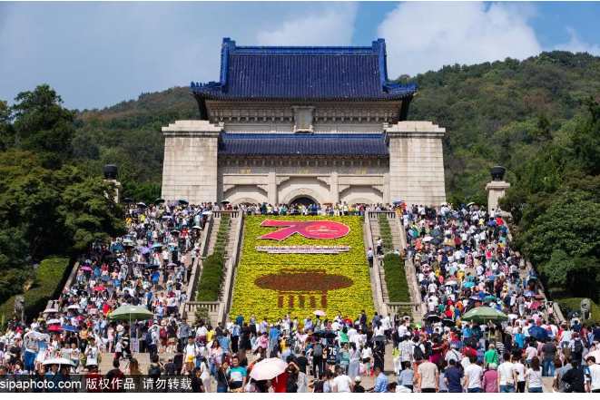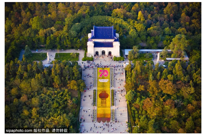 整个建筑依山而建,由北向南排列在一条中轴线上,墓地布局呈“警钟”形图案,从空中往下看,中山陵像一座平卧在绿绒毯上的自由钟~
