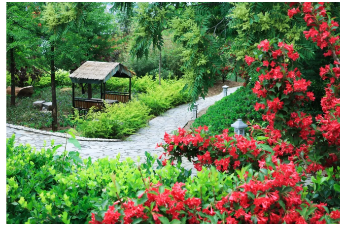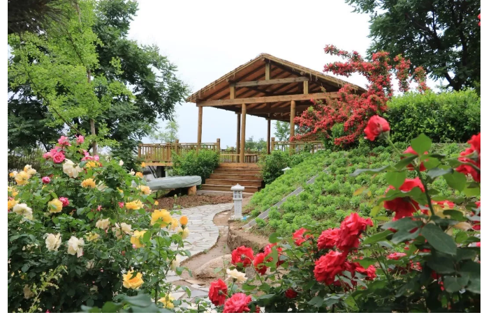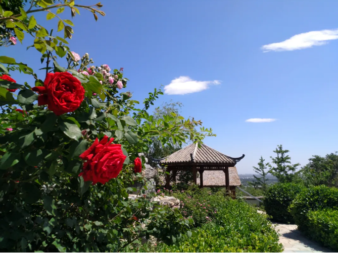 进入门中,面前有两条小径,左面通往明德草堂,小径两旁被绿植、嫩草铺满,蔷薇、石榴花开满了园子,大大小小的角落都有她们的“倩影”。