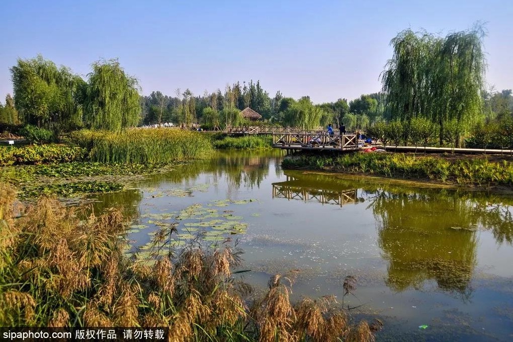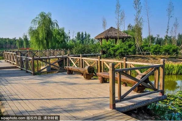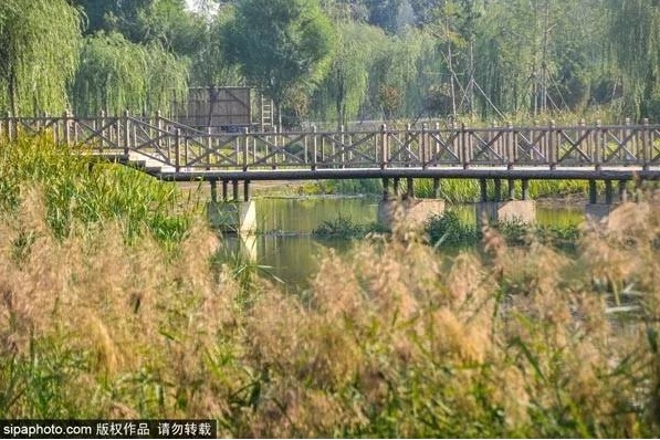公园的绿化做得非常好,沿着小路漫步,满眼尽是森林、水泊、小桥、湿地,简直美得如诗如画。木栈桥蜿蜒曲折给人一种曲径通幽的诗意感,最不能错过的还要数湿地景观,湿地处有一大片芦苇荡,放眼望去,像是一片绿色的海洋。