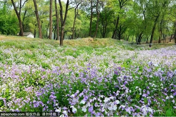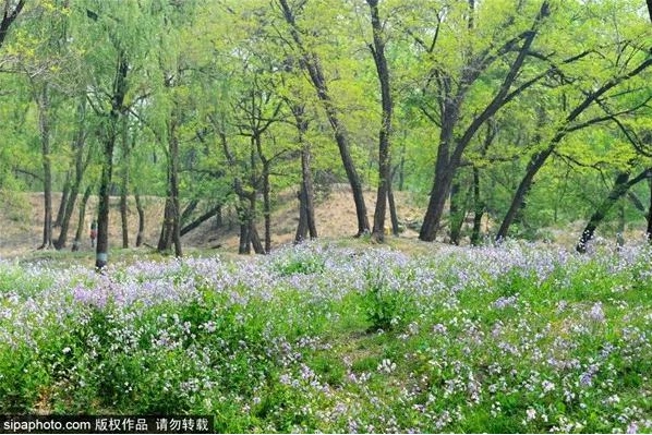 玉东公园位于玉泉山角下,大片的二月兰铺满地,好似一层淡紫色的花毯。