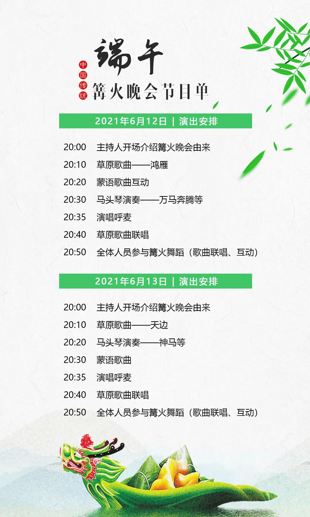篝火晚会将为我们带来什么样的精彩演出?让我们一起看看节目单,先睹为快吧!这个端午,让我们齐聚龙庆峡,怡情、狂欢!High翻小长假!想要观看端午音乐演出,记得选择出行日期6月12日、13日哦~提前预约购票,开启精彩的端午之旅!