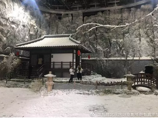 天上满天飘落的雪花,是用专门的雪花水做成的。地面上的积雪则是由特意制作的纸屑堆积。