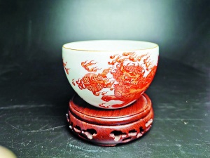 “携子上朝”主人杯,器型是茶盏中非常经典的“风水缸”。手绘图案“太师、少师”,题材取至古代瓷器常见的一种绘画纹饰,运用中国传统工笔白描技法以矾红绘制,色彩明艳贵气。“太师”和“少师”均为古代官名,古三公中位最尊者为“太师”,“少师”“少傅”与“少保”合称“三少”。选择“狮子”作为绘画题材,是取“狮”“师”同音,以“太师、少师”为高官禄位的象征,而借音借意以“狮”为“师”是官运亨通之意,一大一小的狮子表示望子成龙,祝愿代代高官。