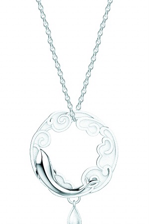 “鱼跃花见”项链,提取鱼、花、水珠为主要创意元素,鱼是锦鲤鱼,可以带来好运,花是牡丹花,象征富贵吉祥,材质主体选用925银结合色彩明艳的松石绿、宝石蓝,以冷珐琅工艺进行制作,整体设计为圆形轮廓,圆形轮廓内为鱼、中国传统水波纹样及牡丹花朵融合设计,下垂小珠,更显灵动。