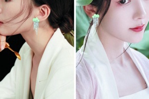 “扶摇”耳坠,作品外观创意灵感源自自然现象:水气上升形成云,云聚降雨,雨冻结冰,冰凌中闪烁着白色珍珠,营造出冰清玉洁的美人氛围。产品材质选用天然玛瑙和925银镶嵌而成,耳坠上的祥云选用青色玛瑙,青色祥云寓意“不坠青云之志,扶摇直上九万里”,云的下部金属零星散布着细小的珍珠。适用于日常通勤,也可以与汉服搭配,时尚新潮又不失古典美。