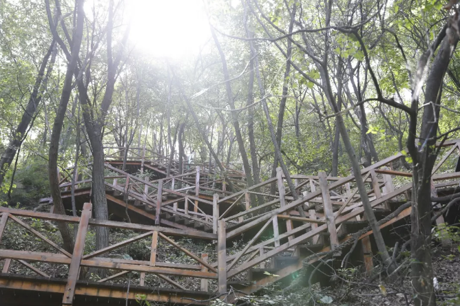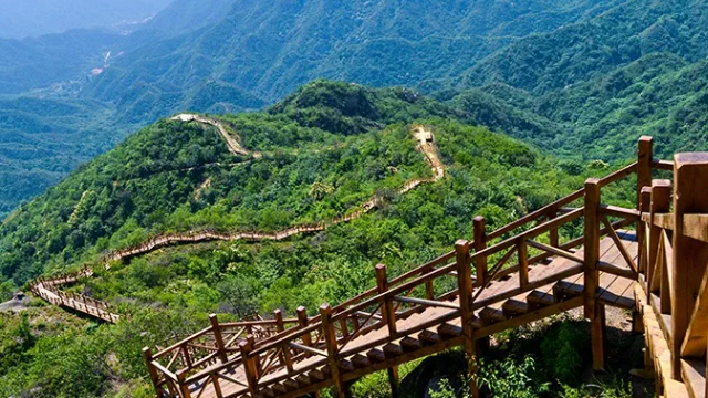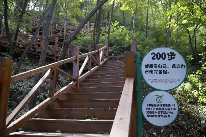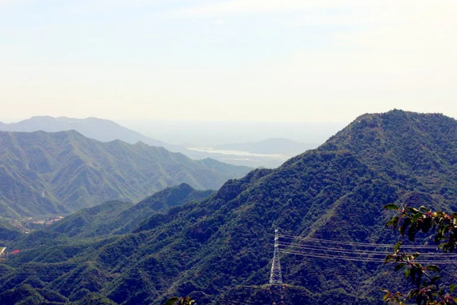 漫步绿海步道间,缓步而行,登至山顶远望十三陵水库。
