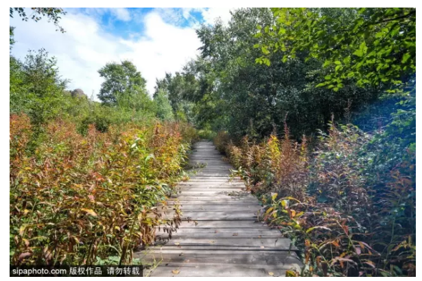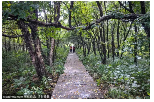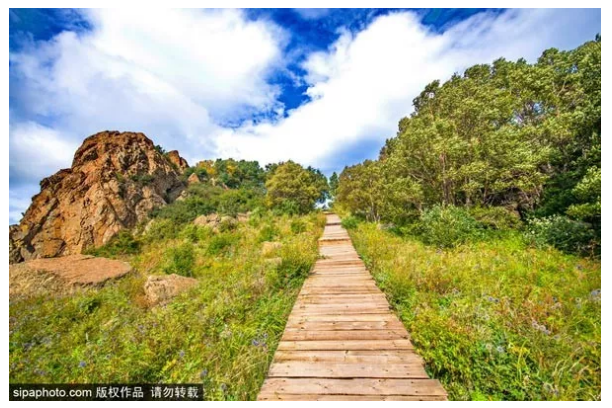 炎炎夏日,想来一场不流汗的登山,就可以选择景区的休闲路线,木质栈道蜿蜒曲折,一眼望去不见尽头,仿佛与天边相连一般。