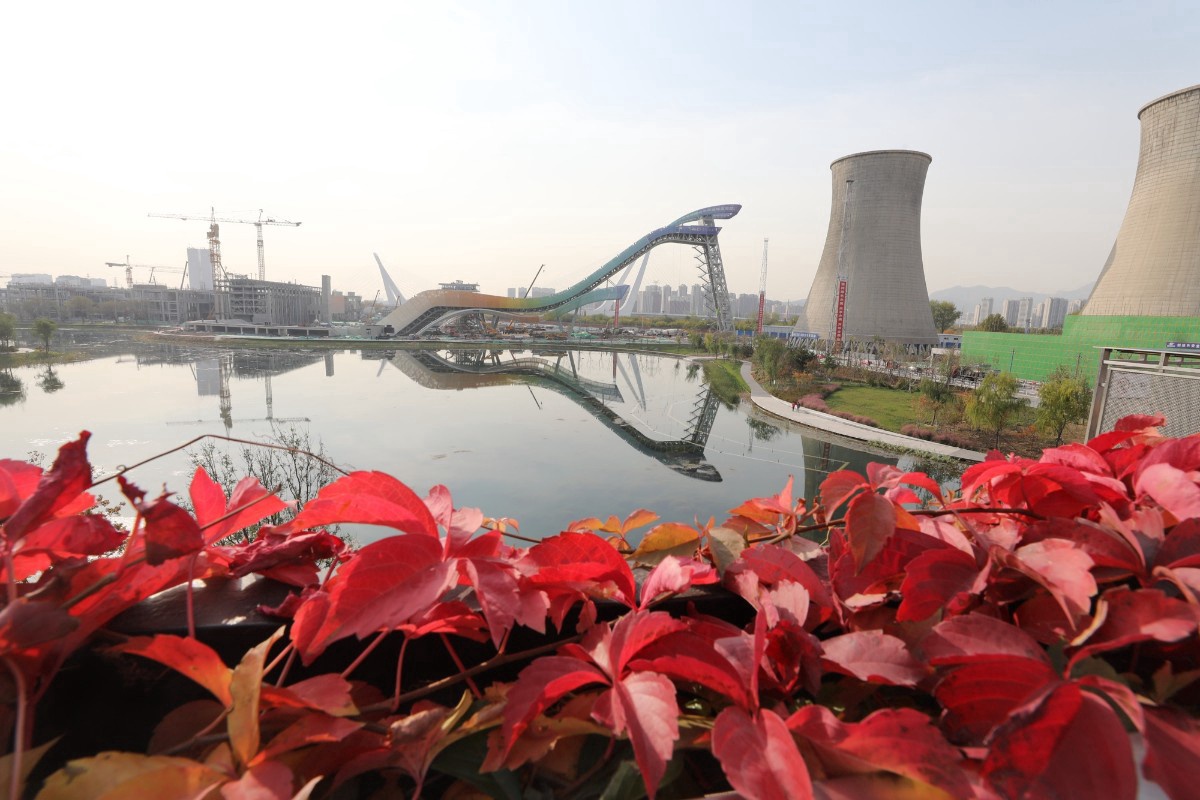 站在首钢园区内高线公园高处远眺,石景山和群明湖交相辉映,四座高耸的冷却塔巍然矗立,别具一格的工业风景象前,是刚刚完工的首钢滑雪大跳台。从远处看,大跳台好似一条“飞天”的飘带。