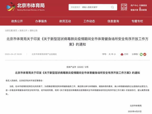 21日晚,北京市体育局官网发布了关于印发《关于新型冠状病毒肺炎疫情期间全市体育健身场所安全有序开放工作方案》(下称《方案》)的通知,明确:即日起,将推进室外、室内体育健身场所有序安全开放。