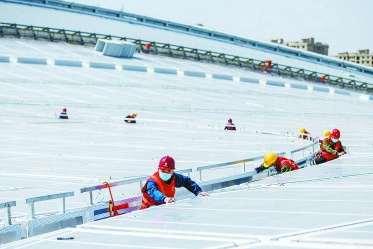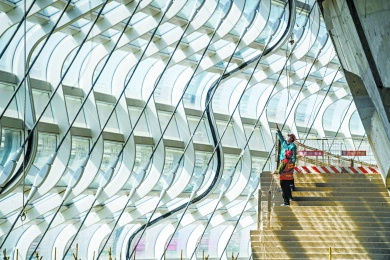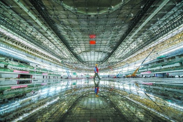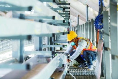 “您瞧,‘天幕’下没有吊顶,因此,机电管线的外观就得更好看。”副经理唐馨庭指着高空的风管举例,一圈88个风口,开口尺寸和角度都得一模一样。如何实现?这就得依靠技术手段,先在工厂通过预制化加工出风管,然后采用先地面拼装后分段提升的方法,将管线提升至安装位置,再由工人完成最后的固定。