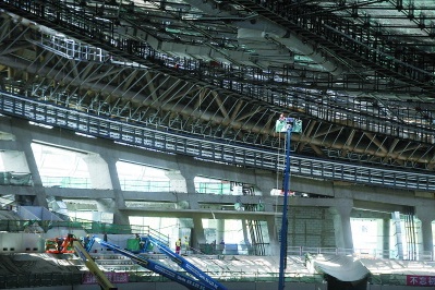 “天幕”,是对国家速滑馆索网屋面的形象化描述,就像提起建筑面积约8万平方米的国家速滑馆主场馆,人们总爱依据其造型称为“冰丝带”。长跨198米、短跨124米的钢索网,仿佛森林的“顶盖”,张拉出一个世界之最——世界体育馆中规模最大的单层双向正交马鞍形屋面。