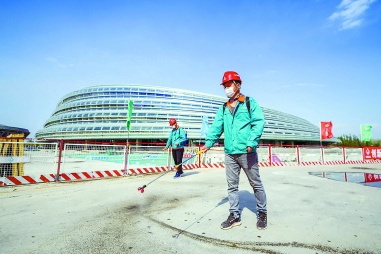下午3点,当吴华强还在高空作业时,国家速滑馆项目西门至生活区的道路上,两名年轻人背着近30斤重的消毒液正在给路面消毒。这支由项目管理人员组成,由青年党员担任队长的防疫消毒队,每天要对包括作业面、生活区、办公区等各个角落进行两次消毒。“众志成城,抗疫必胜!”为了助力抗疫,市重大办、北京国家速滑馆公司特别为建设者送来了口罩、消毒液等防疫用品。