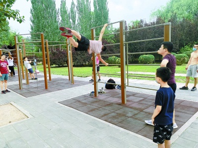 朝阳公园东门附近,一处只有4组铁质健身器材的场地内,常有“业余体操队”驻场。3名健身爱好者轮番上阵,做出单杠大回环、倒挂云梯、人体旗帜、空中漫步等高难度动作,吸引十多位游人观看,其中不乏跃跃欲试者。