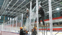 在装完界墙后,上面还要安装亚克力板。可别小看这个透明的板,它可是关乎球员和观众的安全。在冰球比赛中,小小的冰球被运动员们推来射去,快的时候时速能达150公里。高高的亚克力板能有效地将冰球拦住,以免造成意外伤害或破坏冰场周围的设施。能作为安全屏障,是因为亚克力板不同于一般建筑用板,它柔韧度极高,即使运动员在比赛中撞上它也会被弹回,这可以避免运动员受到伤害。