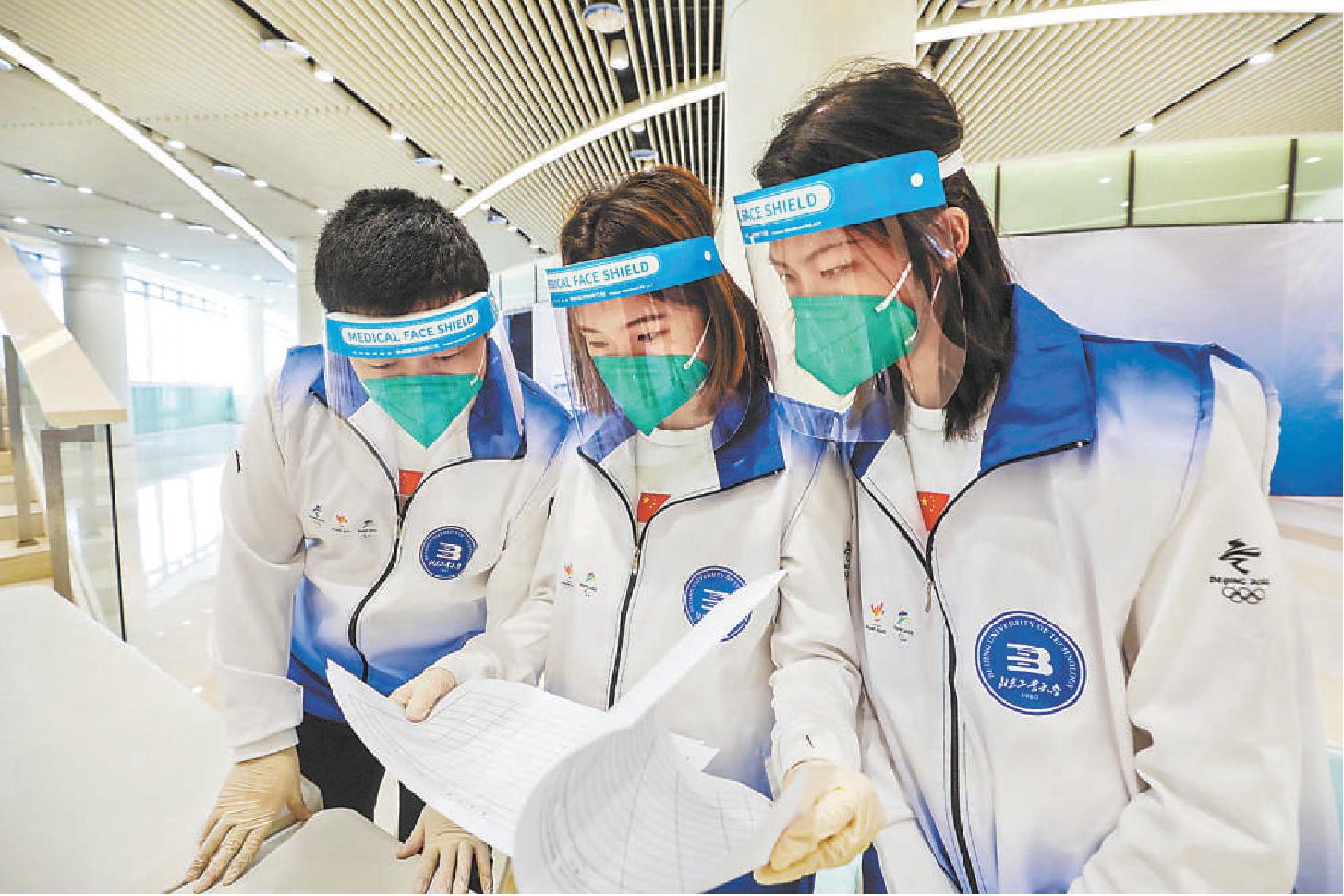 北京冬奥村运行区、居住区、广场区三大功能区域的志愿者在严格防疫基础上,开始服务演练工作。