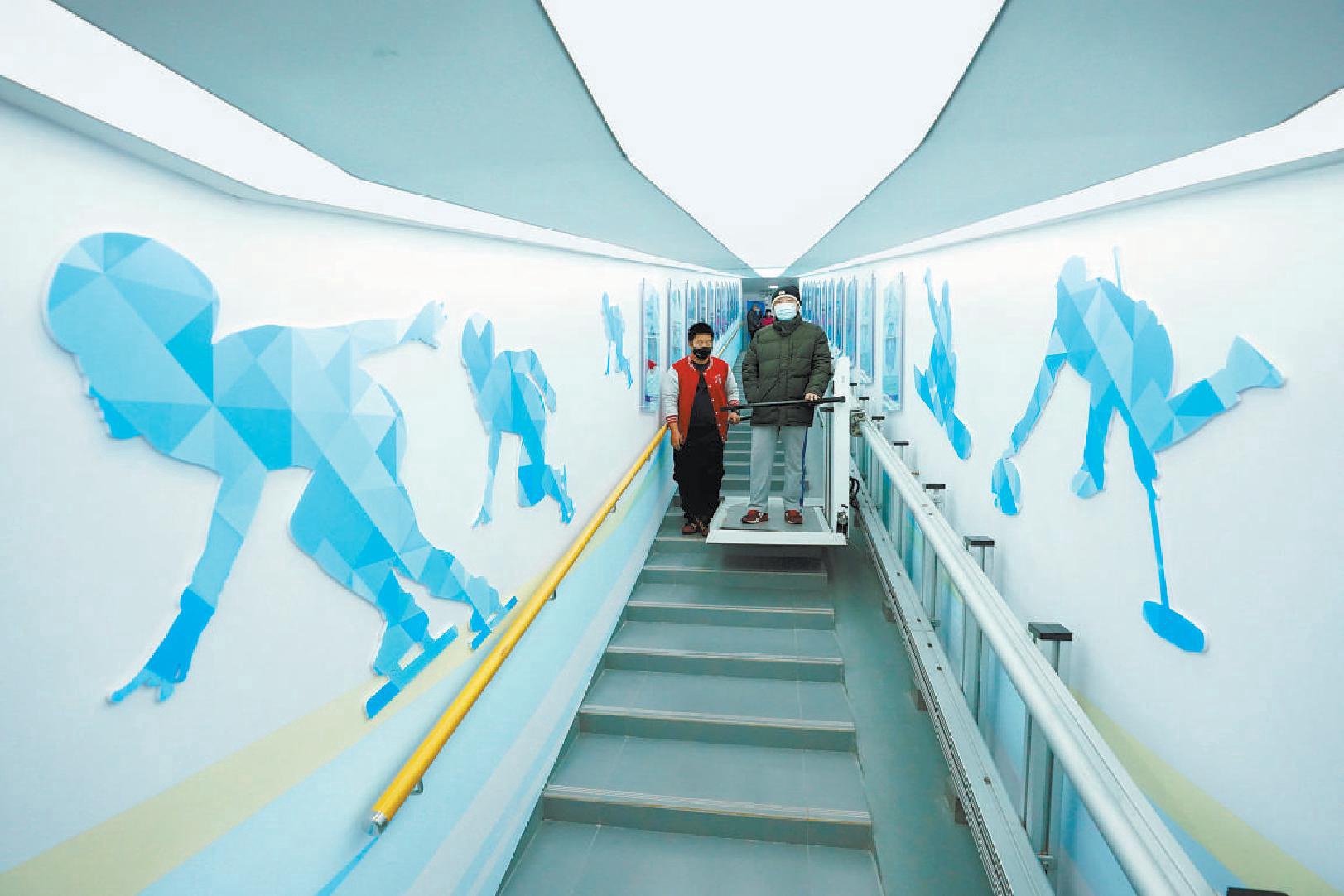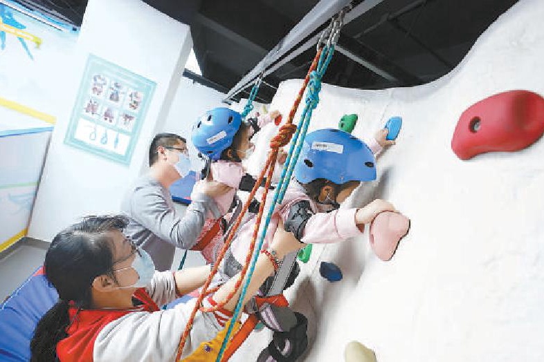 在一旁的儿童攀岩区,一位小朋友正在家人的帮助下努力向上攀登。“真是太好了,不仅有了活动场所,还能近距离了解冬奥知识,学习冰雪技能,以后一定带孩子常来。”