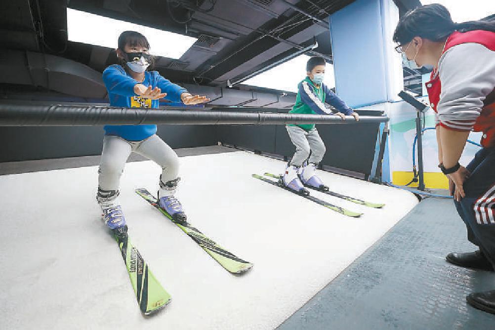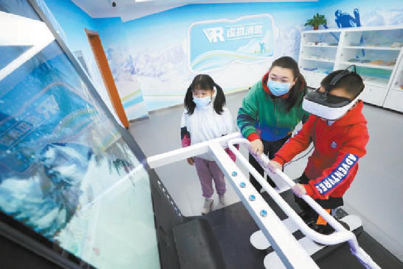 “向前看,使劲蹬,千万别害怕。”在智慧滑雪体验区,一位小学生正在教练的指导下,在铺满仿真雪的斜坡上练习基本动作。