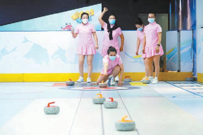 这里没有真正的冰雪,体验项目都是模拟冰雪环境,在冰壶训练场,记者看到地面光滑,有雪道的感觉,区别于真正的冰壶,球体更轻,下方增设了3个滑轮,方便运动员推送。