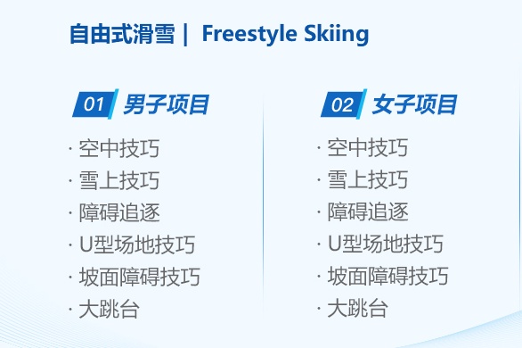 自由式滑雪:是以滑雪板和滑雪杖为工具,通过完成一系列的规定和自选动作而进行的一种雪上比赛项目。此次北京冬奥会上,自由式滑雪将分为雪上技巧、空中技巧、坡面障碍技巧、障碍追逐、U型场地技巧和大跳台等6个小项,共将诞生13枚金牌。除大跳台项目在首钢冰雪大跳台举办之外,其余项目均在张家口市崇礼区的云顶滑雪公园举行。