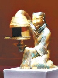 展厅另一侧,是鼎鼎大名的汉代长信宫灯,这盏灯也是北京冬奥会火种灯的创意来源。长信宫灯造型轻巧华丽,一位跪地执灯的宫女,左手执灯盘,灯盘中心有灯芯,右臂高高举起,垂下的袖管成为灯罩;设计巧妙环保,宫女的袖管与身体连接形成烟道,当灯烛点燃时,烟灰顺着袖管徐徐进入中空的身体,从而保持室内环境清洁。