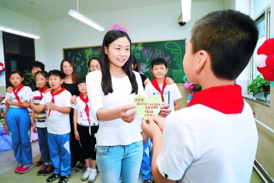 在教师节来临之际,石景山区原黄庄学校的师生在新学校开展“感恩教师 茁壮成长”主题活动,同学们将写有祝福话语的“爱心”贴纸和鲜花献给老师,庆祝共同迈入新学年。