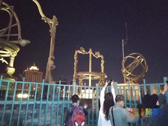 登台一样要排队,因为台上空间有限,所以一次上去的人数不能太多。等啊等,终于到了可以登台的那一刻,登上古观象台,天体仪、象限仪、赤道经纬仪、地平经纬仪等8个古老的天文仪器静静地矗立在那里,听工作人员讲解,这些仪器曾经被列强掠走,历经波折,终于又回到故土。