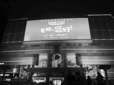 昨天晚上,蓝岛大厦户外大屏幕为教师亮灯:“老师,您好!”
