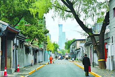 今年4月12日,架空线入地工程结束后的第二天,西总布探索取消路侧停车位,试行不停车。天净、地净、胡同净,从西口往东口走,正好能看到远处矗立着的国贸三期大楼,到了晚上灯光璀璨,传统和现代交织,别有一番韵味。