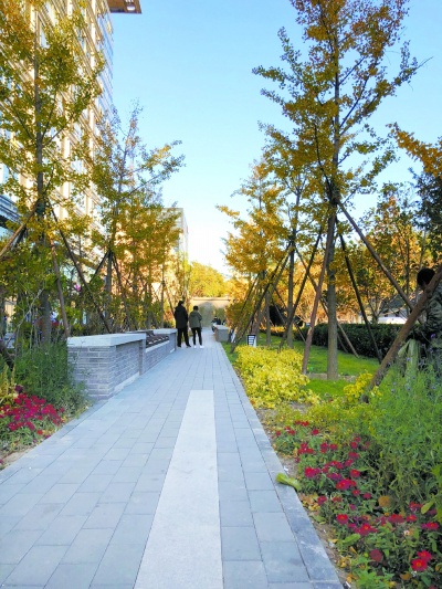 王奶奶是青龙胡同小区的老居民了,今年74岁。她回忆说:“此前,雍和大厦南广场建有假山、喷泉、简易绿地等景观,主要供楼内上班族使用。这个小广场和相邻的青龙胡同之间还建有一堵墙,墙外的居民想进小广场,得走到西头从大门进入,不太方便。雍和广场这处街心花园建成后,看着家门口的环境更美了,心情也更舒心了,现在每天都会过来散会儿步。”王奶奶笑着说道。