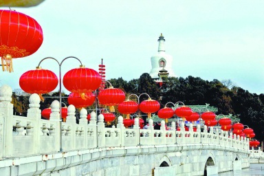 昨天,北海公园内的永安桥上,对对红灯笼与白塔相映成趣,“年味儿”十足。京报集团记者 吴镝 摄