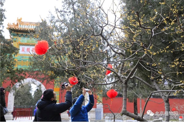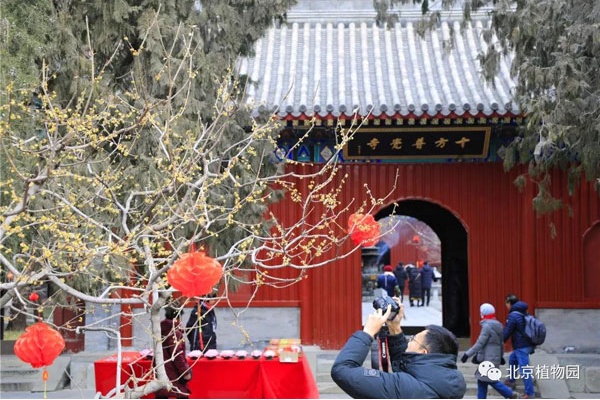 与此同时,在园区卧佛寺内,数十株蜡梅花正值观赏期。金黄色的小花在红墙的映衬之下分外美丽,一阵阵幽香更是沁人心脾。预计蜡梅花期可持续至三月上旬。