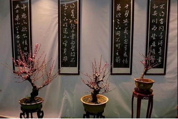室内千余盆梅花盆景涵盖五大品种竞相开放,冯氏十三式全部树型,有三十余盆具有上百年和十余盆超过二百年的古梅桩陆续展出,珍贵品种——镇馆之宝“西风烈”。