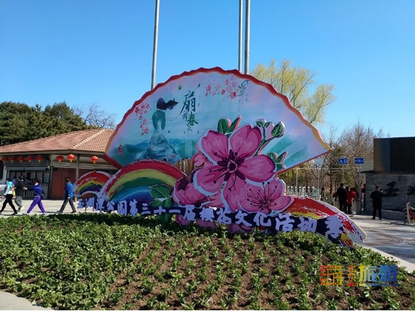 门口的主题为“扇舞春天”的形象牌,已经搭了起来。公园内,路边的指示牌和各处悬挂的红灯笼也已经就位,将玉渊潭装饰一新。