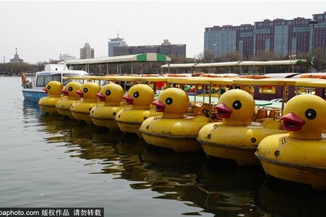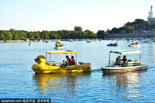 在波光粼粼的太液池上,造型独特的荷花船,轻盈灵巧的手划船,宽敞舒适的电瓶船,返朴归真的脚踏船,憨态可掬的黄鸭船,活泼可爱的卡通船等 460多条船只将满足市民游客的不同需求。